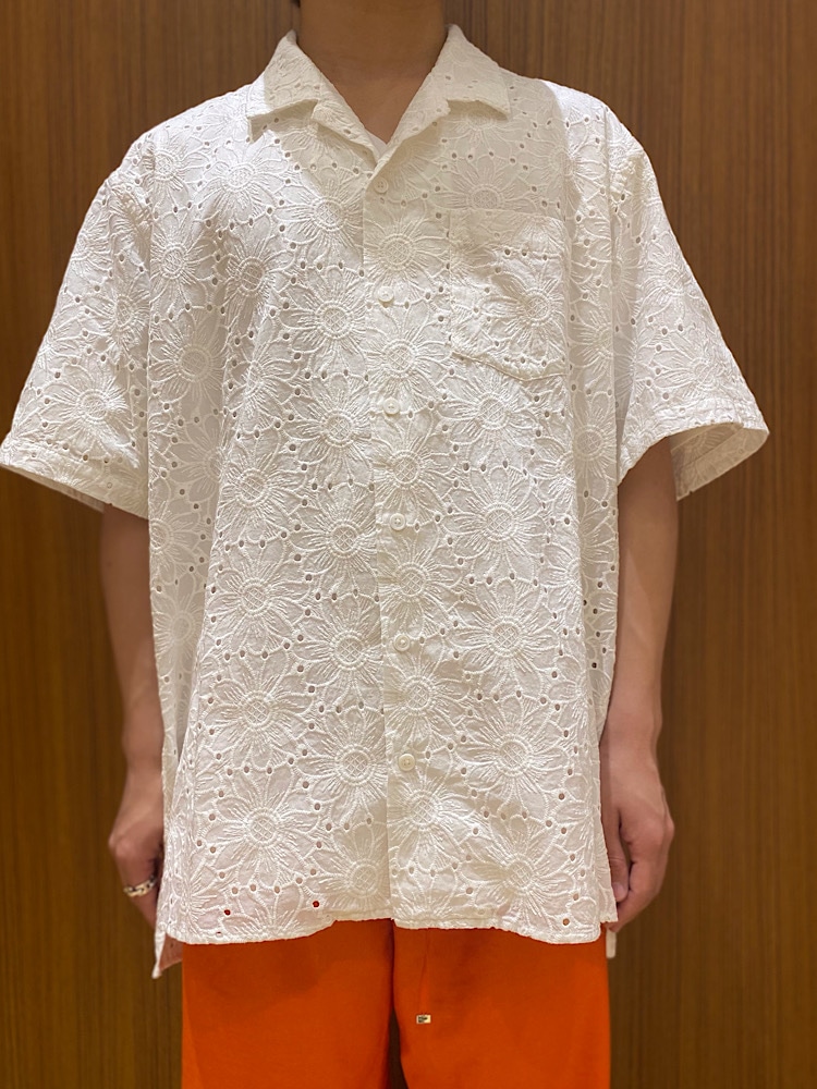 着用感: トレンドでもある花の刺繍がとても綺麗です。加えて明るい色味のオープンカラーシャツなので季節感、シーズン感共に演出してくれるシャツです。前を止めていただいてもいいですし開けて着ていただいても良いと思います。