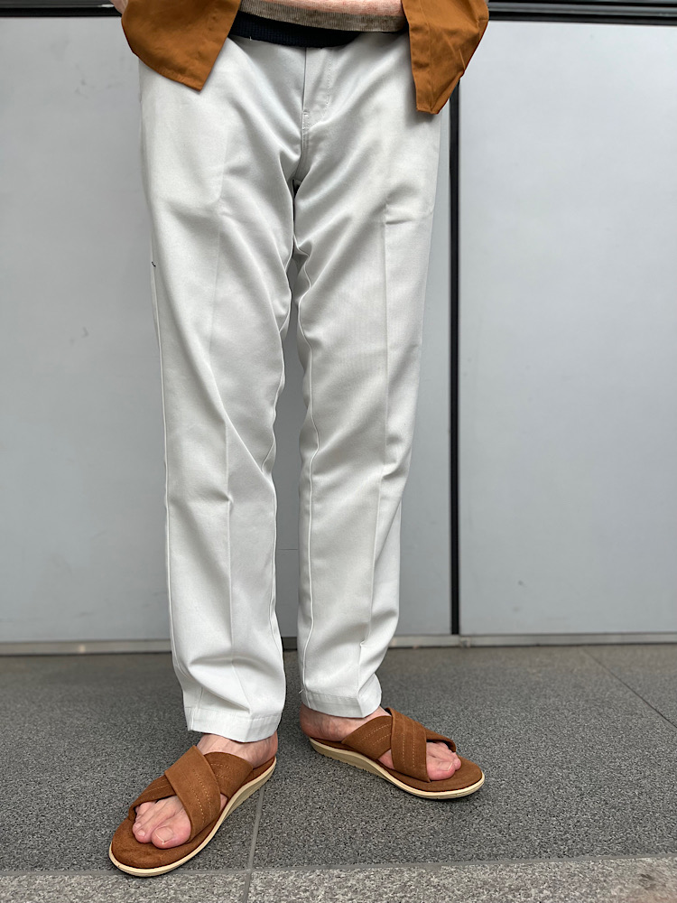 サイズ感:脚の綺麗なラインが出るようにややテーパードをかけ、それに合わせて股上もやや短くしたパターン。