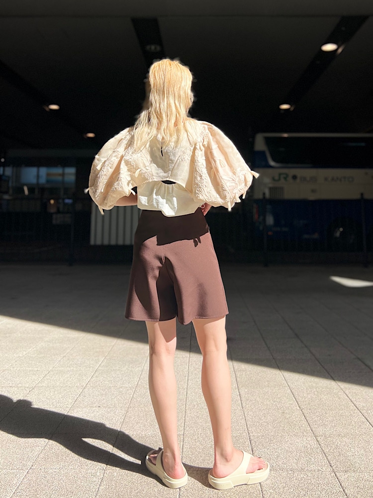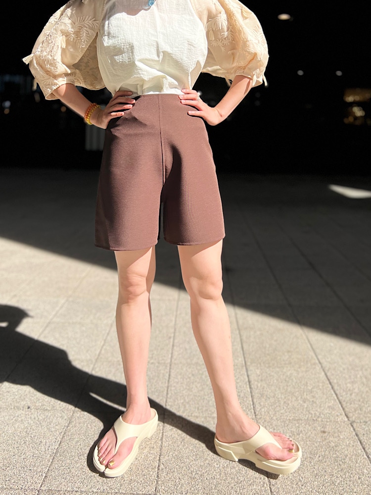 ・着こなしポイント : 少し甘めのトップスだったので、落ち着いたカラーのこちらのショーツを合わせてみました