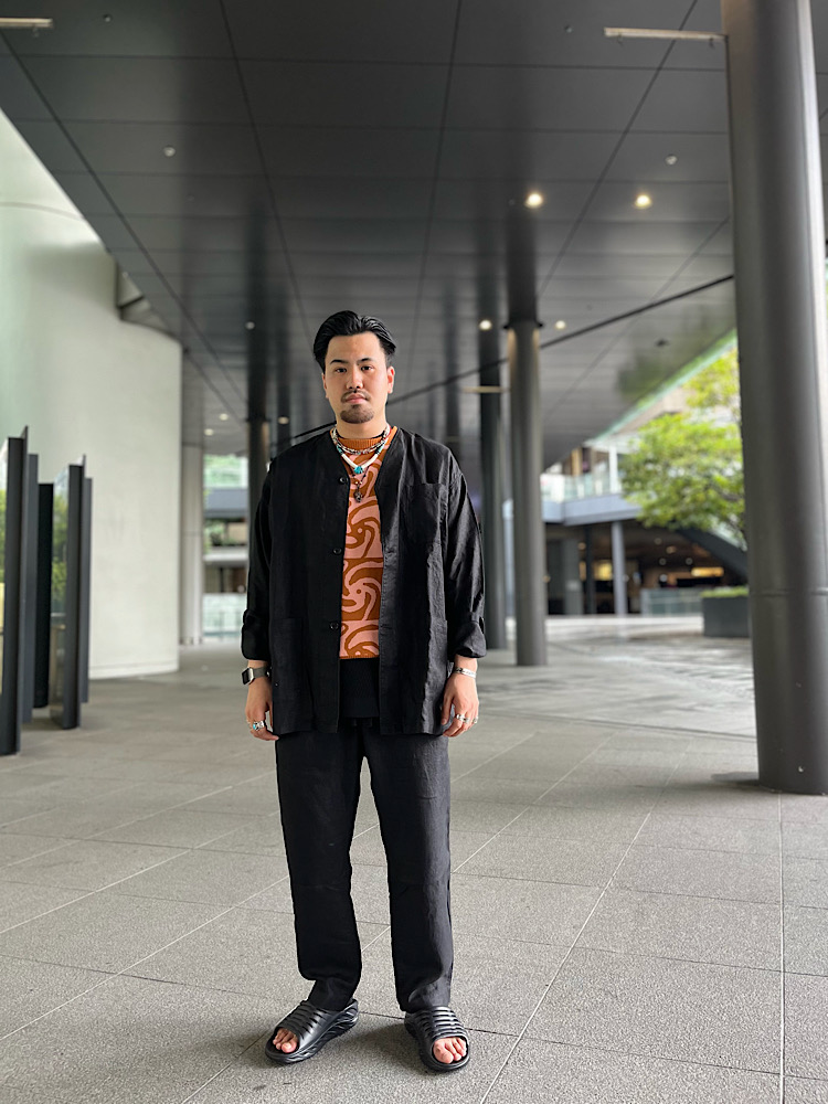 【素材感・着心地】リネンのジャケットなので通気性もよく、リネンの風合いがノーカラージャケットのカジュアルさを引き立ててくれています。