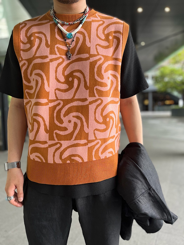 【素材感・着心地】発色の良いコットンのニットベストで少し地厚ではありますが、着心地は軽くTシャツの上からでも、インナーとしても重宝する一枚です。