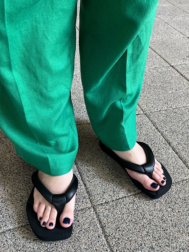 【素材感・着心地】腰周りにタックが入っており、テーパードの形ですがゆったりしたシルエットです。ベルトが太めなのでコーディネートを引き締めてくれます。