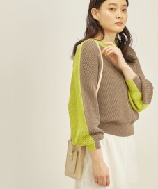 素材感・着心地:シャリっとした質感のニットです。ローゲージでやや透け感があるので、タンクトップなどのインナーは必要です。肌離れが良いので梅雨時期まで着られそうです。