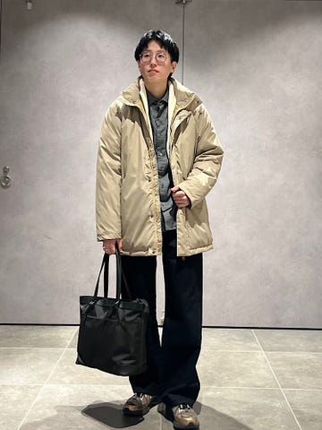 サイズ感:パーカーやニットなど厚めのインナーも着ることができるややリラックスしたフィット。