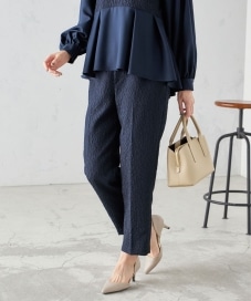 素材感・着心地:ブラウスの柄と同じパンツです。膝下はスッキリとしたラインです。タックが入っているので、お腹まわりを目隠ししてくれます。