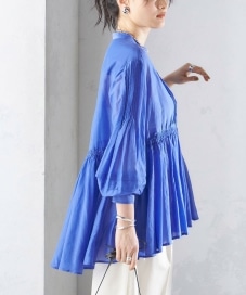 着心地:透け感のあるコットン、シルク素材。光沢感の感じられる上品な1枚です。裾のフリルはボリュームが出過ぎず程良いアクセントになります。