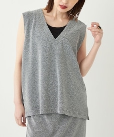 【素材感・着心地】シルバーラメのVネックトップス。深めのVネックでスッキリとした印象。