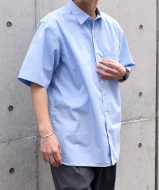 清涼感のある無地のブルーカラーシャツでハリのあるコットン生地を使用しており、サラッとした肌触りです!シンプルなデザインなのでコーディネートが組みやすいです!
