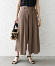 ポリエステル100%で着心地は軽く清涼感のある生地感です。足首あたりまでの丈感なので小柄な方にも合わせやすい長さになっています。オンオフ兼用で使えてラフスタイルにもお仕事着のキレイめなブラウス合わせにも相性良いです。