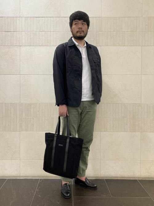 シャツの色を白にすると、シューズのキャメルが浮いてしまい、必要以上に目立つ為、淡いトーンのブルー系シャツが季節感の面でも合わせやすい。