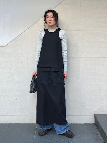 【素材感・着心地】所々透け感のあるニットです。前後2WAYの仕様なので着回しが可能です。着丈はジャストなのでボトムを選びません