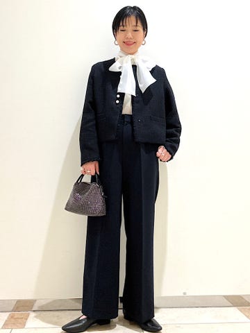 クロップド丈でボリュームが出過ぎず、すっきり着用できる。ネイビーの落ち着いた色味で、ラメが派手になり過ぎない。