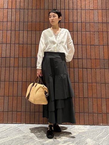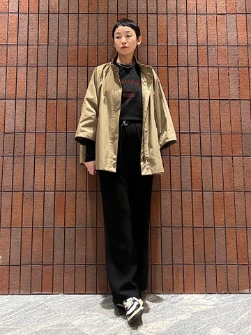 程良い身幅感と、アームも広めでフレンチスリーブになっているので、思ったよりタイトにならず大人な雰囲気で着こなせます!夏までしっかり活躍する1枚です。