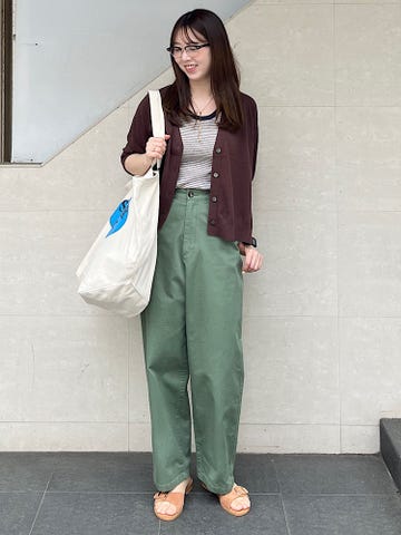 ワンピースの丈が少し短めなのでパンツでレイヤードスタイルに。