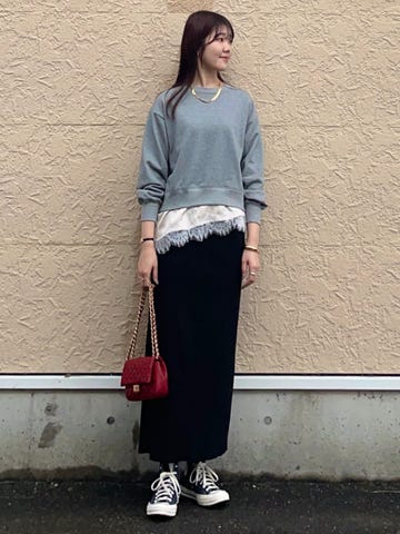 後ろの紐で長さを調節できるので、身長やコーディネートに合わせて着用できる。ロングスリーブのカットソーで合わせたり、アウターを羽織ると秋らしく着られる。