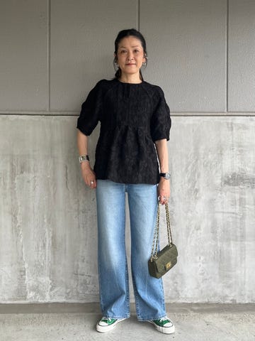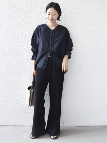 素材感・着心地:スラックスのようなストレートパンツですがウエストゴムなので同時にリラックス感も楽しめます。カジュアルにスニーカーでも、バレエシューズで通勤にもおすすめです。