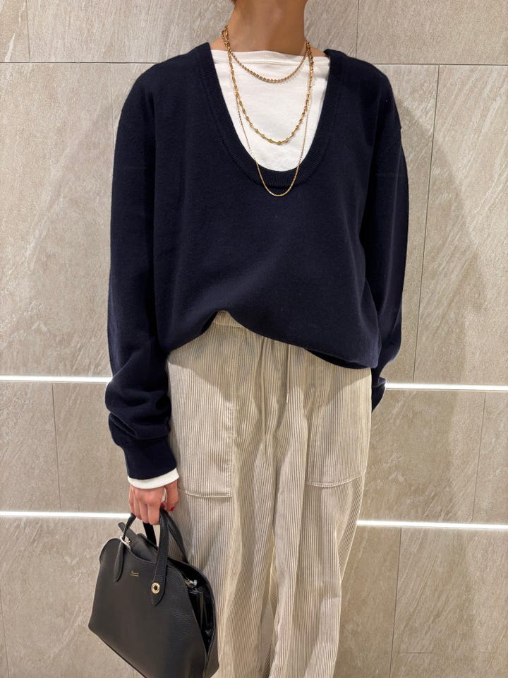 素材感・着心地:カシミヤ100%なめらかな肌触りです。深めのUネックの為、中のインナーで雰囲気を変えていただけます。