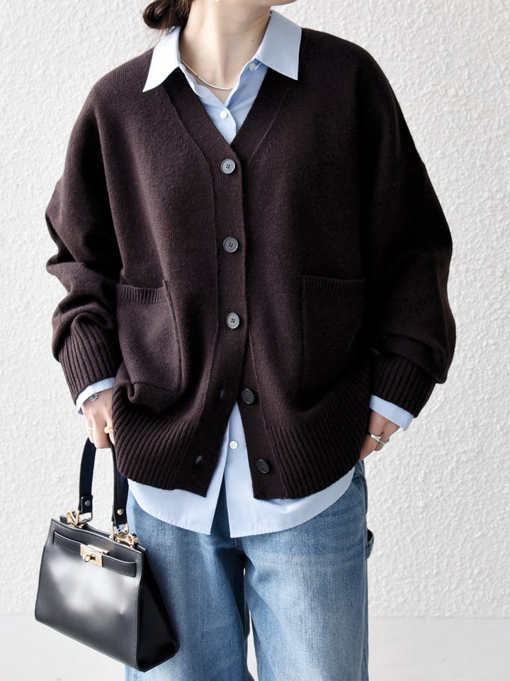 ざっくりカーデ×ブルーシャツで抜け感を作りつつ、小物を黒で揃えてすっきり見えに。