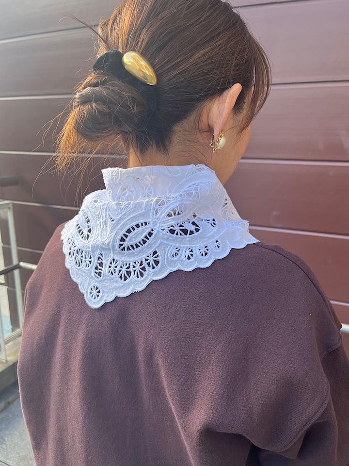 素材感・着心地: レースのスカーフがセットになったバンドカラーシャツ。スカーフを首元に巻くのはもちろん、ウエストに巻いたりバッグに巻いたり、アレンジがいろいろできます。