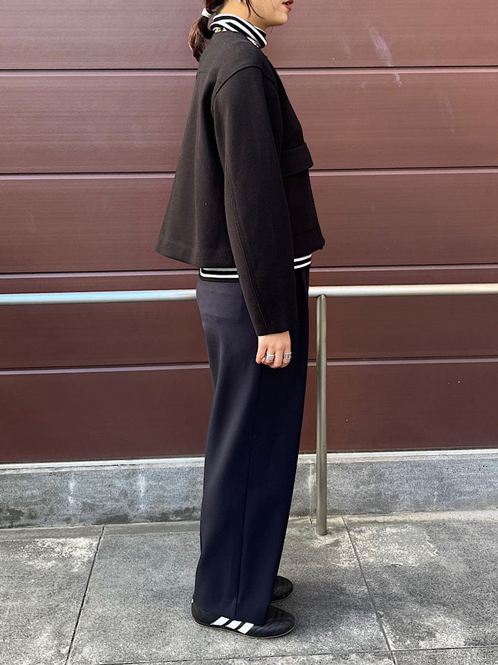 素材感・着心地:ショート丈でボトムスとのバランスもとりやすいです。身幅もゆったりしていてレイヤードスタイルも楽しめます。