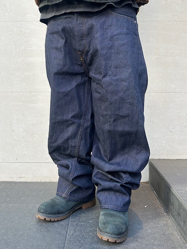 素材感・着心地:捻れが特徴的なデニム。股上が深めで腰回りがゆったりとしている。