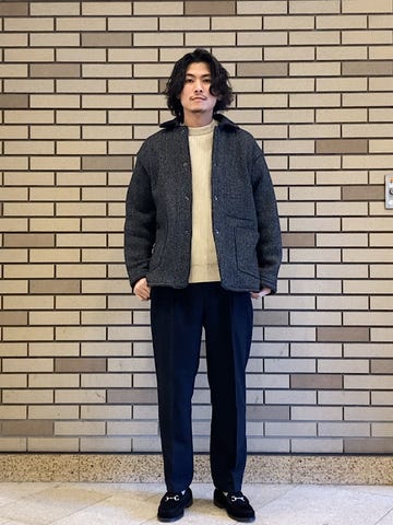 サイズ感:ゆったり目、中に厚手のニット着用できるサイズ感です。