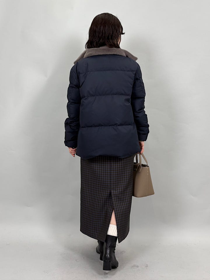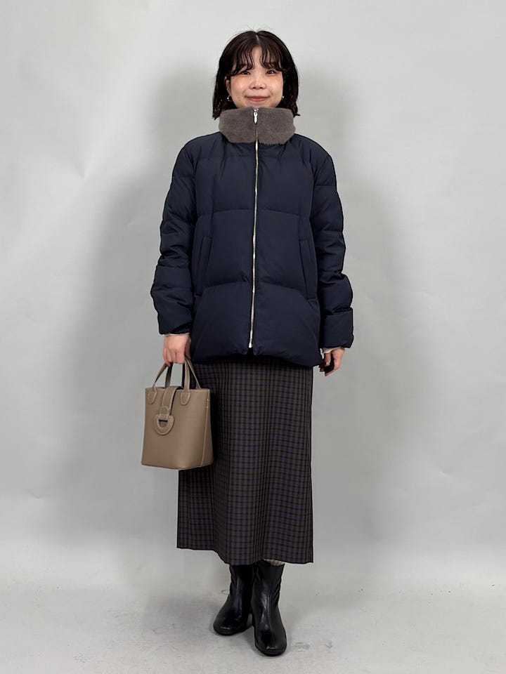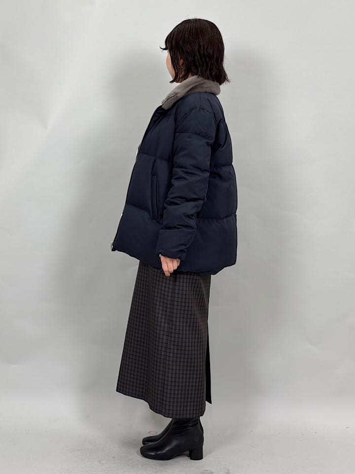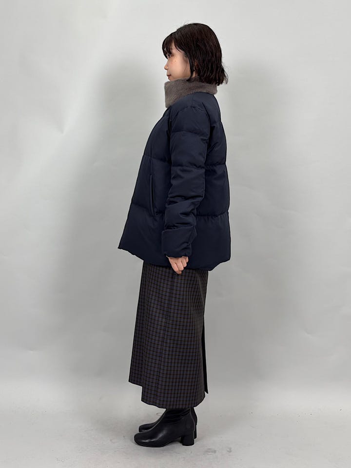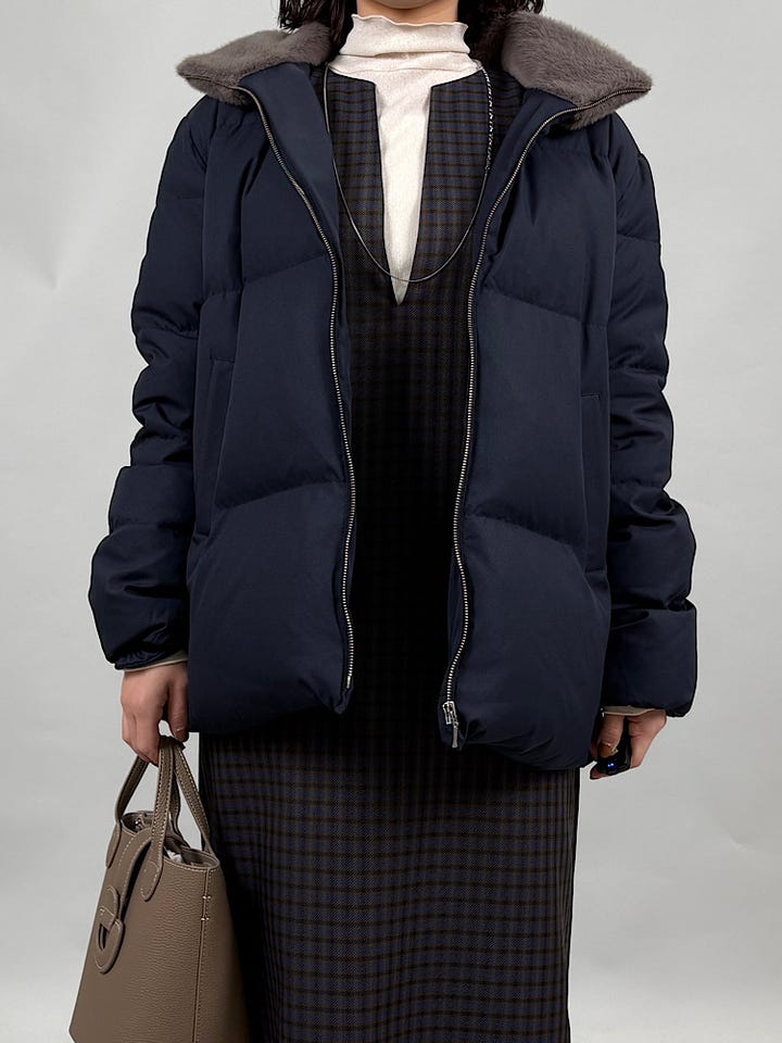 700FPのダウン、フェザー素材。三重県のクリーンで高品質な河田ダウンを使用。首元は表も裏もフェイクファーで、マフラーレスで暖かく着ていただけます◎ややコンパクトな形なので、すっきりと着膨れせず着ていただけます。