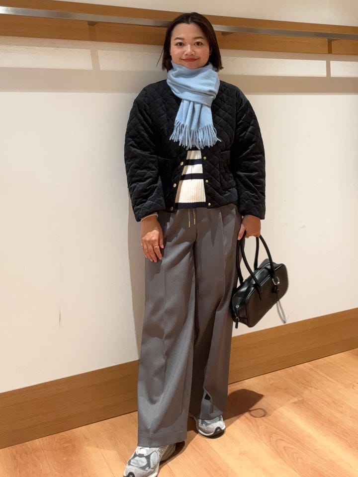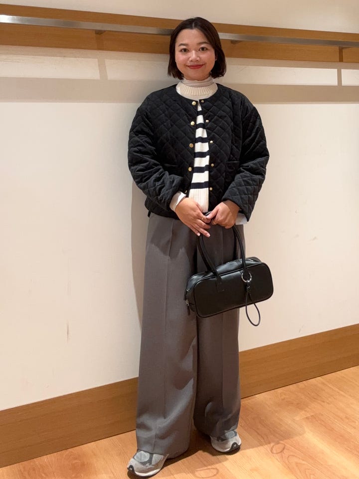 ベロアの光沢感があり女性らしいシルエットのキルティングアウター。ワンピースと合わせてもバランス取りやすいです!