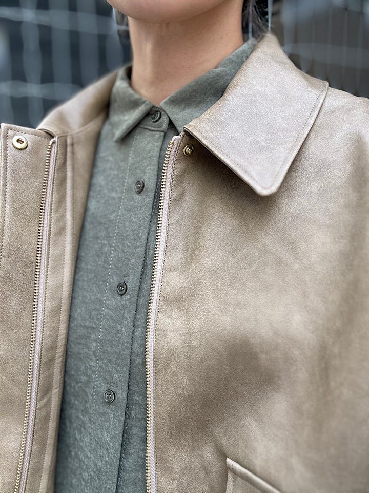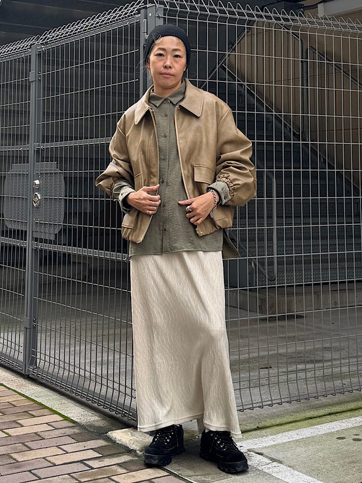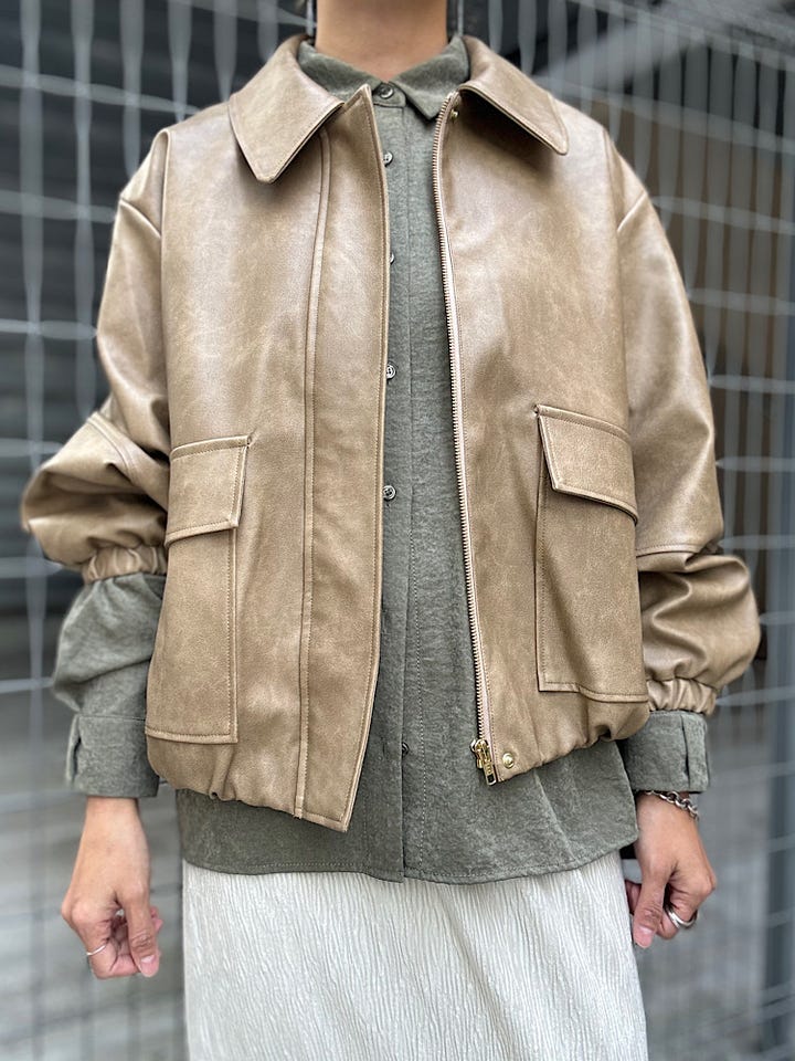 【素材感・着心地】オーバーサイズのバイカージャケット。ハードになり過ぎないベージュカラー。
