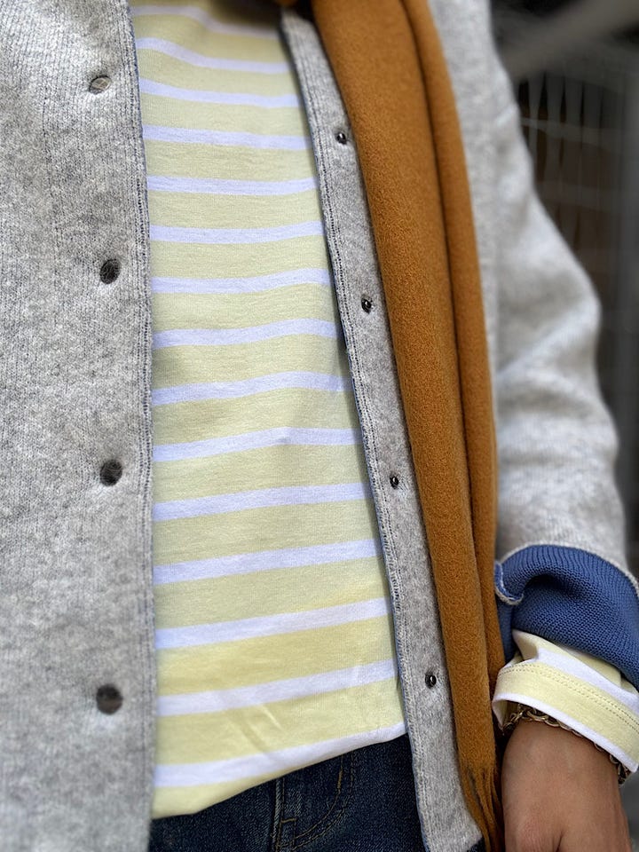 【素材感・着心地】パステルイエローのボーダー長袖Tシャツ。