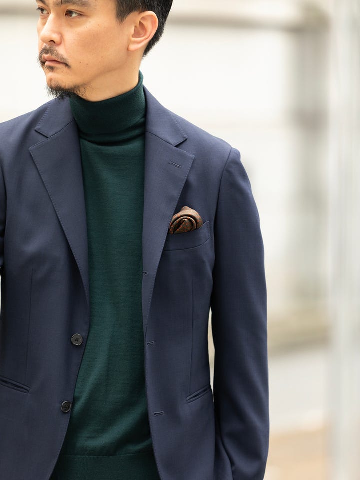 一見するとスーツに近い見栄えですが、タートルネック合わせももちろん組み合わせられます