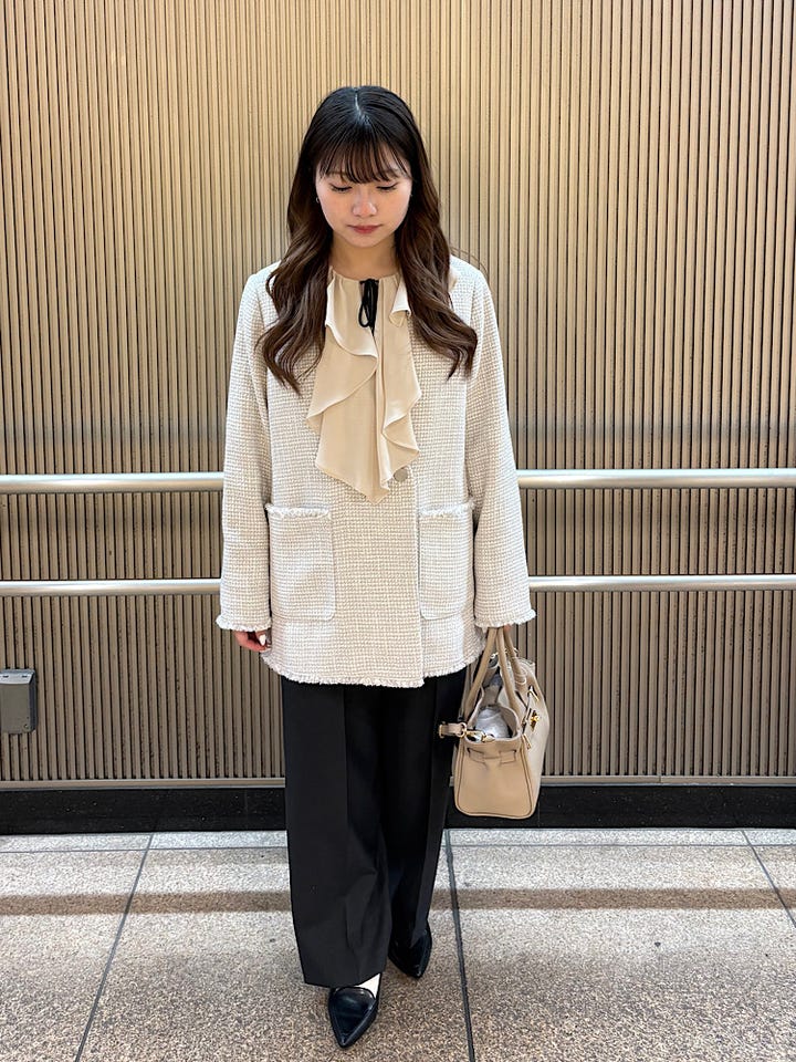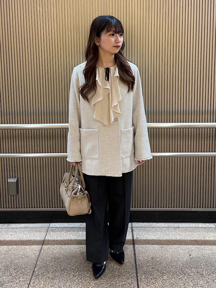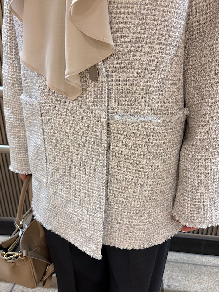 着心地 :軽くてセレモニー感もありながらもボタンでキレイめカジュアルにも着れる万能なジャケット。裾のフリンジがアクセント。