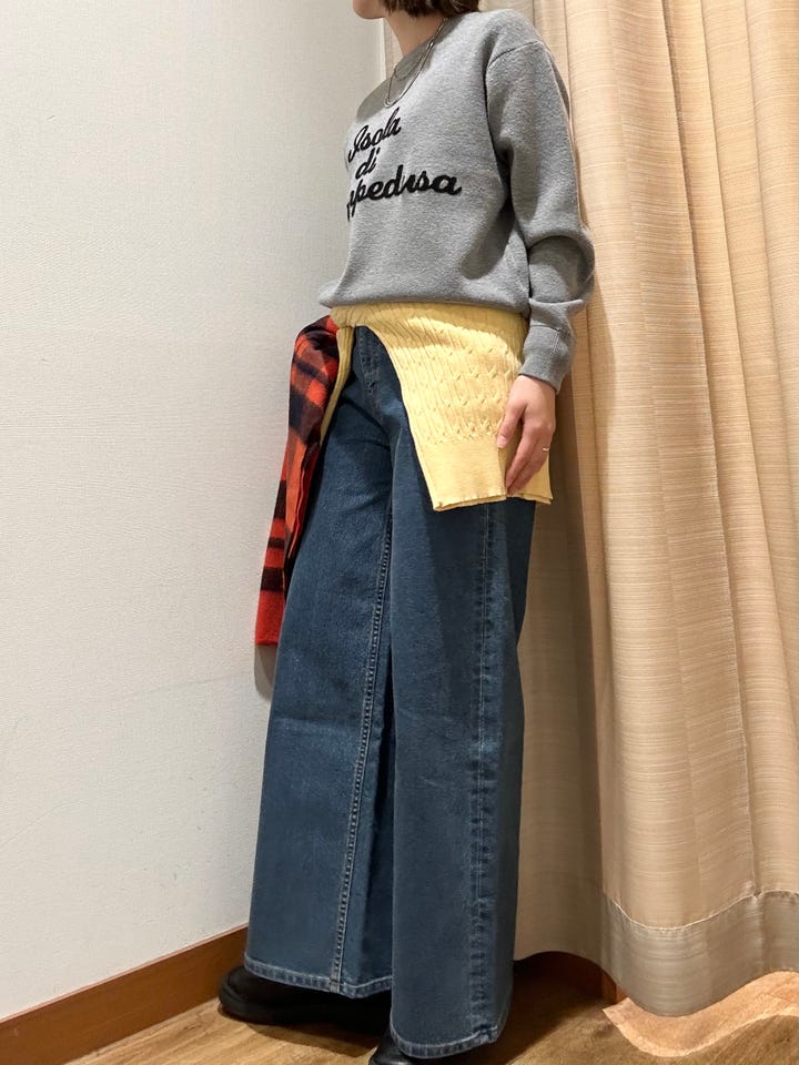 着心地:?ワイドなシルエットが綺麗なデニムパンツです。
