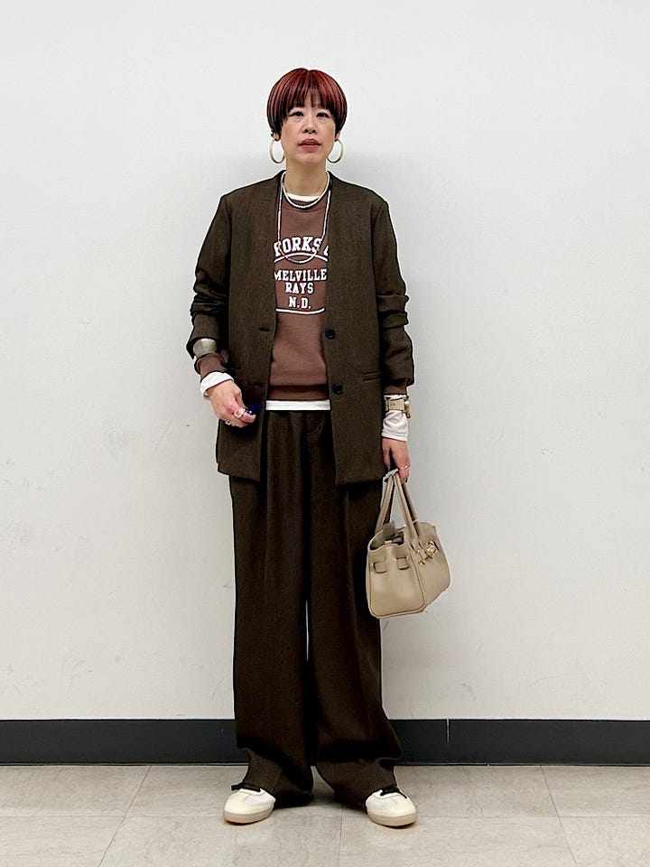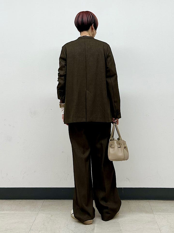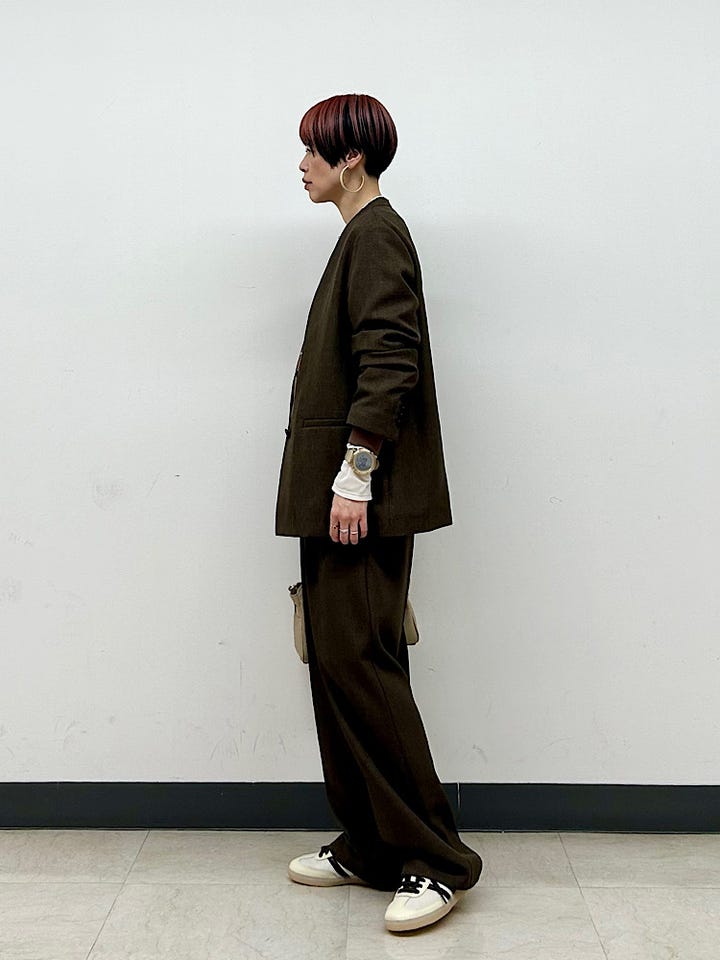 着心地:ジャケットと同じ素材。パンツも裏地なしの軽い仕立て。ハイウエストでも、背中側にゴムが入っており、楽に着られました。