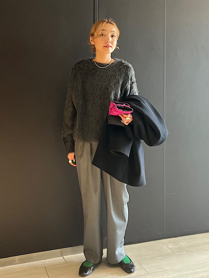 【素材感・着心地】柔らかいアクリル混のニットです。肩周り、身幅はゆったりとしていますが着丈は長すぎないのでボトムを選ばず着用できます