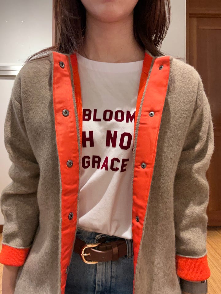?ロゴ部分がふわふわとしたフロッキー生地?になっていて秋冬らしさがあります。?シンプルなのでアウターやカーディガンの中に?仕込みやすいデザインです。?