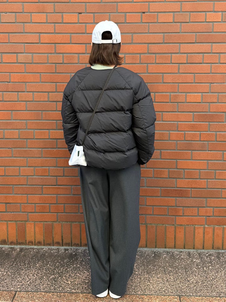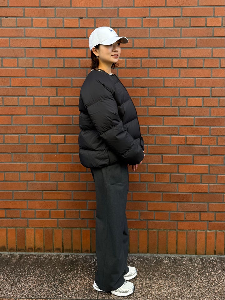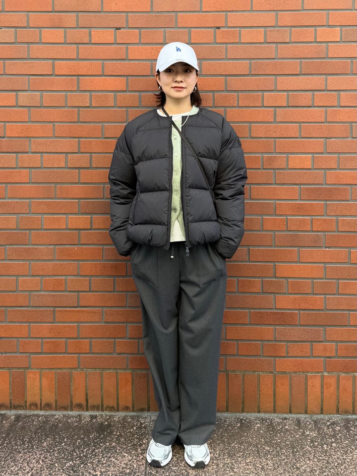 サイズ感・着心地:ゆとりあり。中にまだまだ着込めそうです。コンパクトな丈感でダウン特有の着膨れがなく、苦手意識のある方にも着やすい形です。