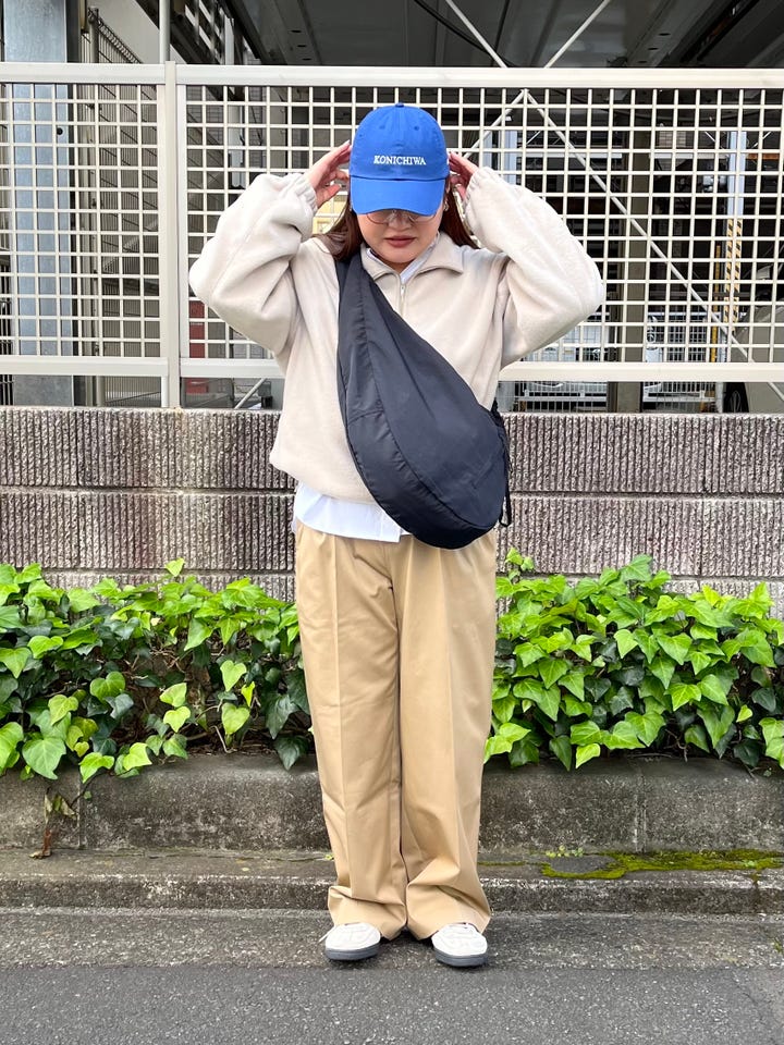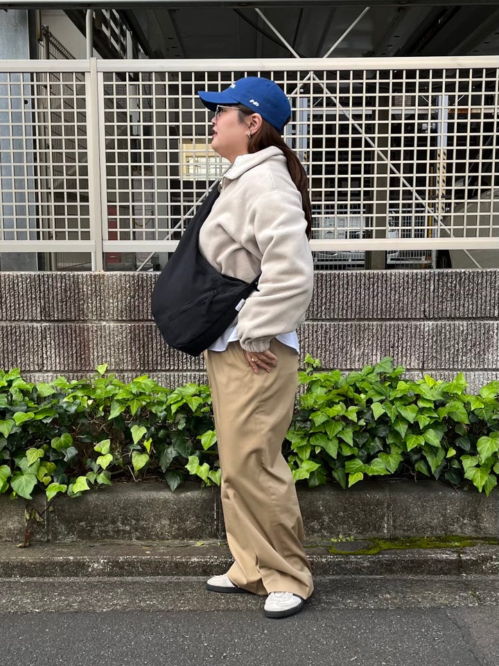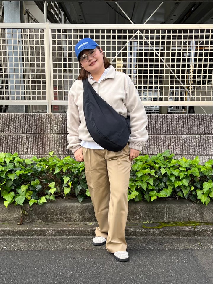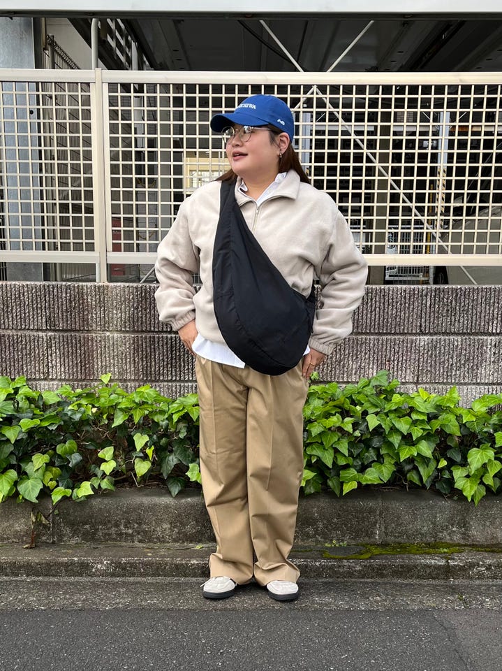 着心地:ゆったりサイズのフリースプルオーバーです!ハーフジップデザインなので、少し開けて襟にして着るのもオススメです。裾のドロストは調節可能だからシルエットで変化をつけて着ても◎