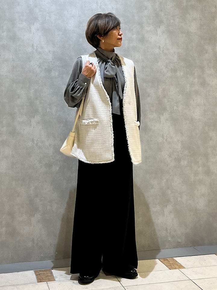 着用感 : 見た目よりも生地感は厚手ではないのでブラウスやニットのインナーがとても合わせやすいです。軽くジャケットっぽい感じで羽織れます。アームホールもゆったりしてるので窮屈さも感じませんので楽に着用出来ます。