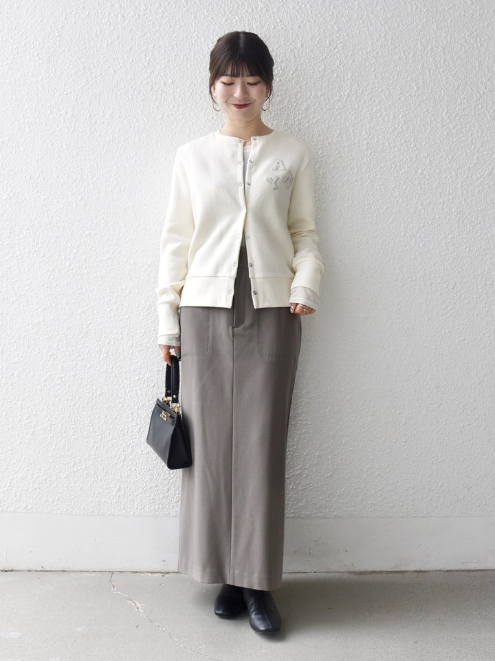 すっきりめのカーディガンにiラインスカートで縦ラインを意識。