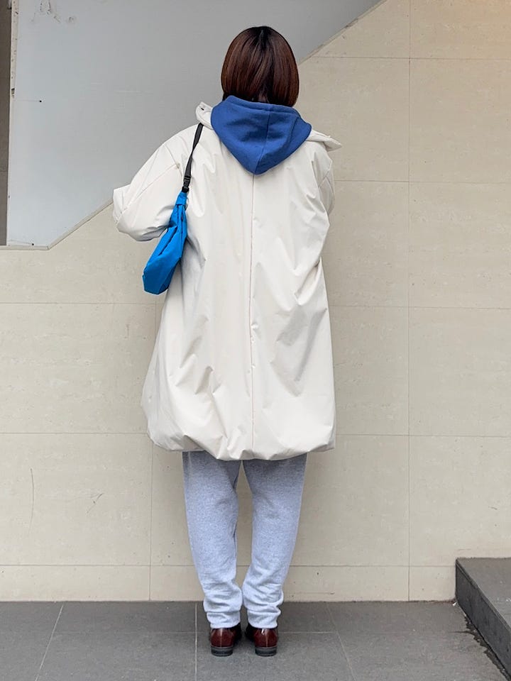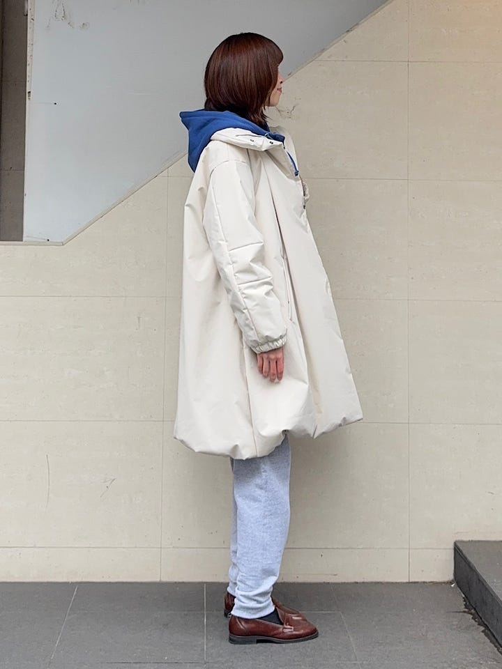 全体的にゆったりとしたサイズ感です。ボリュームありながら軽くて着やすいです。今回はフードを外して着用しました。