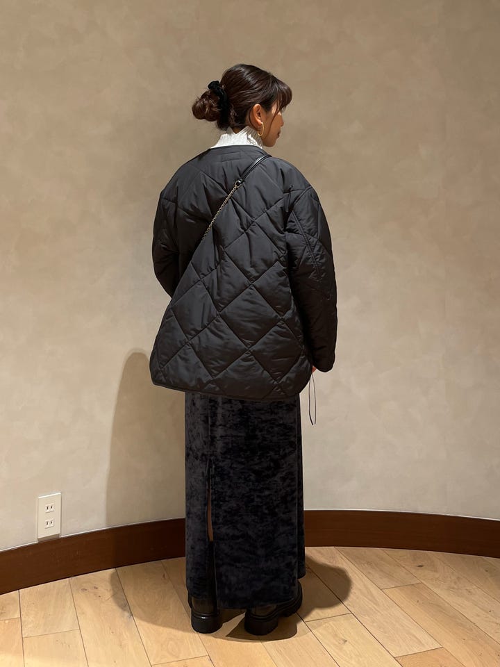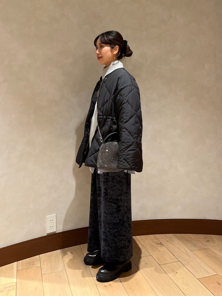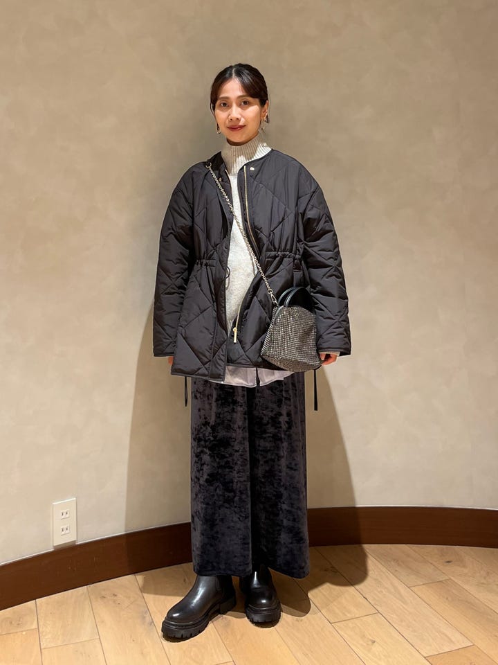 着心地: ポリエステルの中綿で軽く、薄手です。ゆったりした形ですのでインナーにボリュームがあるもののも入れれます。ウエストのドローコードでスッキリとした印象にもできます。