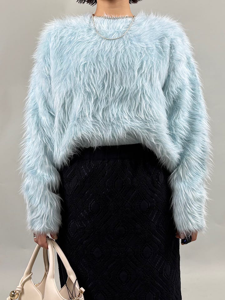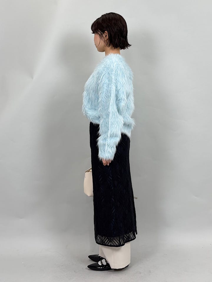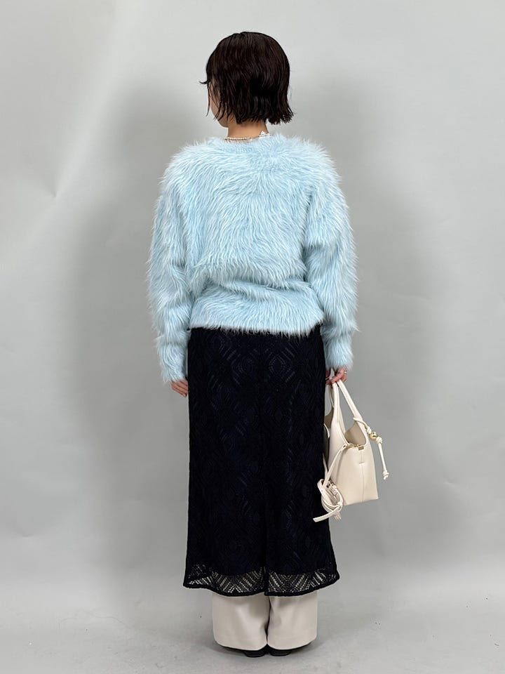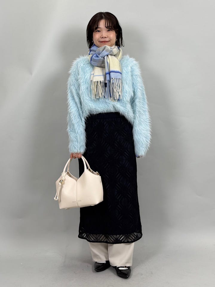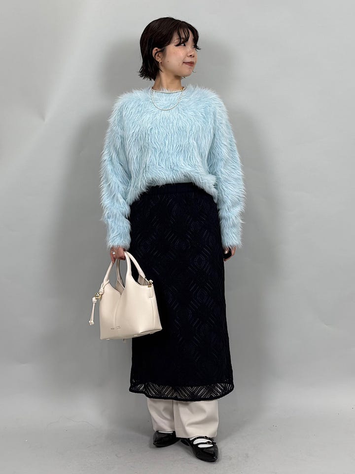 軽くふんわりとあたたかみのある素材感。軽くあたたかい着心地です◎毛足が長く膨らみのあるニットですが、短丈なのでバランスよく着ていただけます。