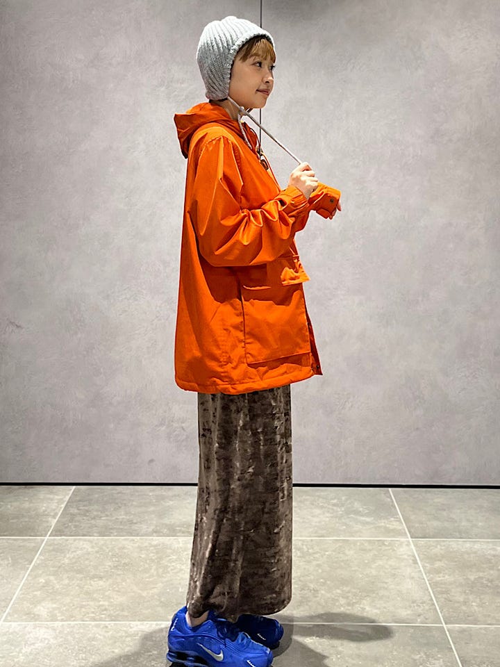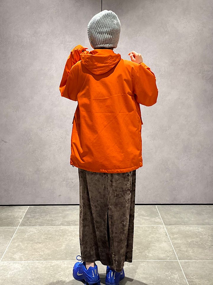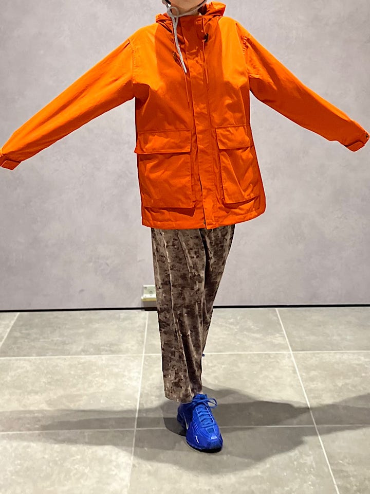 素材感・着心地:メンズサイズSなのですこしゆとりがありますが肩が落ちすぎず薄め生地ですっきりした印象に。オレンジがアクセントに、オーバーサイズのジャケットを上からレイヤードしてもおしゃれに着ていただけそうです。