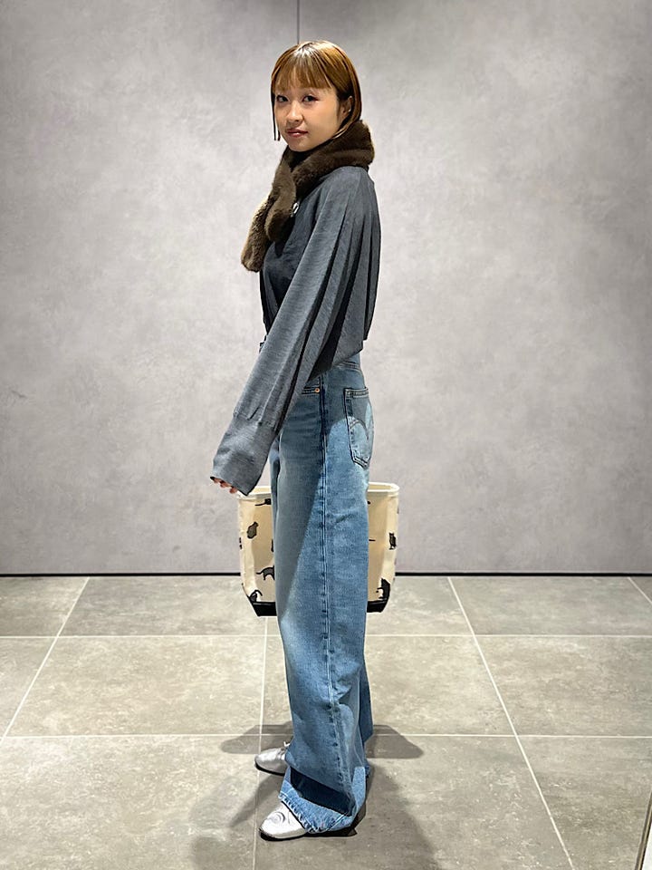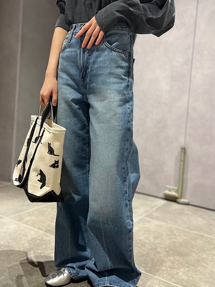 素材感・着心地:フレアに広がりますがウエストはきゅっとくびれるシルエットは足を長くきれいに見せてくれます。柔らかいデニム素材で動きやすいです。バレエシューズでもスニーカーでも合わせやすいです。