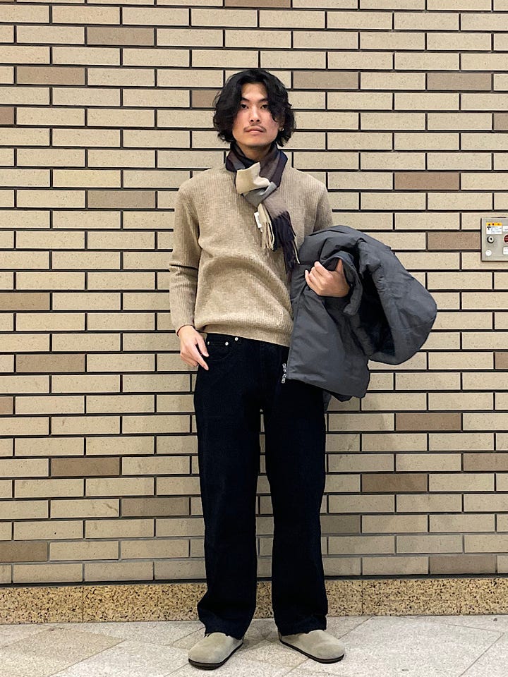 サイズ感:ゆったり目、中に厚手のニット着用できるサイズ感です。