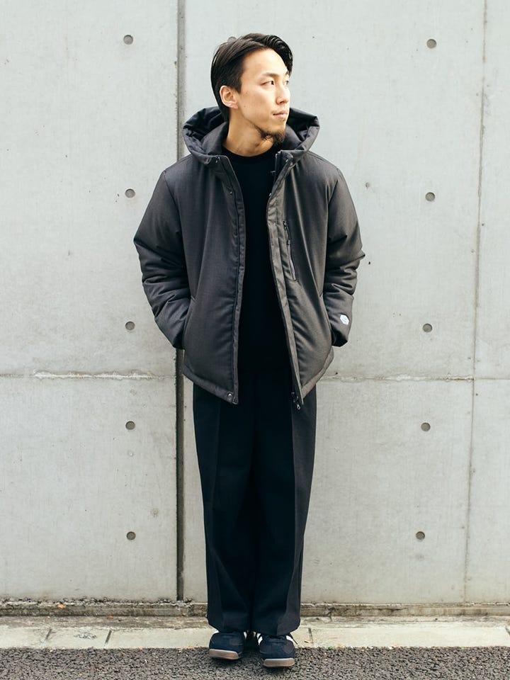 ボリューム感のある中綿ジャケットを使用したカジュアルスタイル。