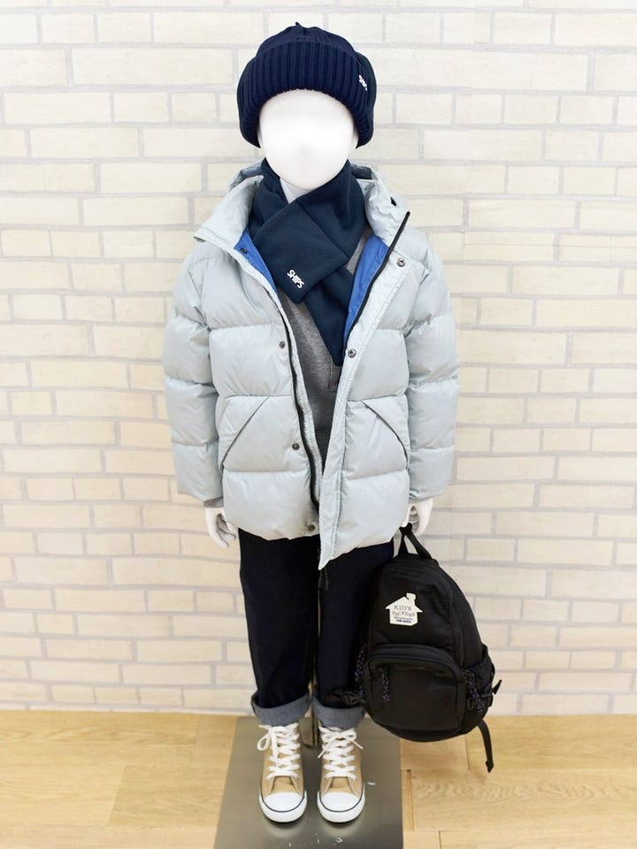 エコダウンを使用したすっきりシルエットのボーイズダウンジャケット。
