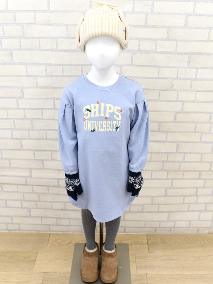 カレッジロゴとお花の刺繍がポイントのスウェットワンピース。