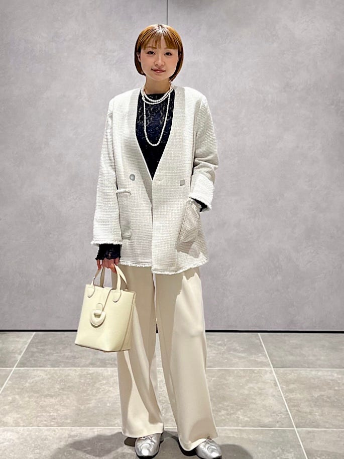 素材感・着心地:肩はゆとりありでデザインブラウスやニットをレイヤードしても着やすいです。ハリがある生地ですがかたくなく、光を集めやすい表面感ある素材は上品な印象に。